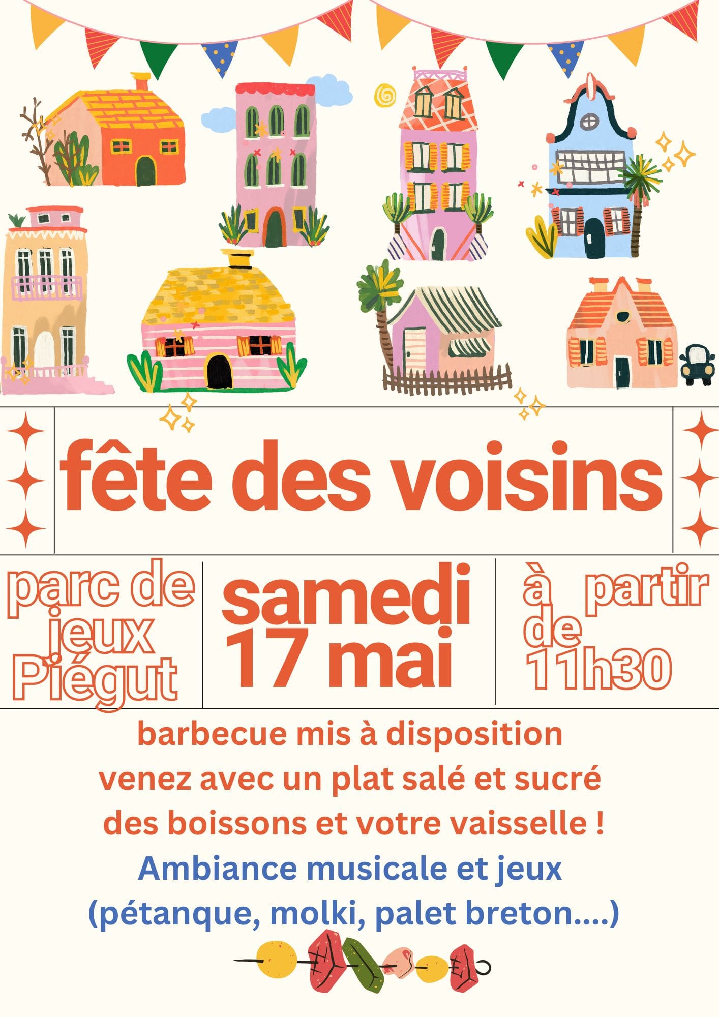 Veuillez trouver en PJ une initiative citoyenne qui permettra aux habitants de Piégut de passer ensemble un moment convivial de partage lors de la « Fête des voisins » qui se déroulera le samedi 17 mai 2025 à partir de 11h30, au parc de jeux de Piégut.