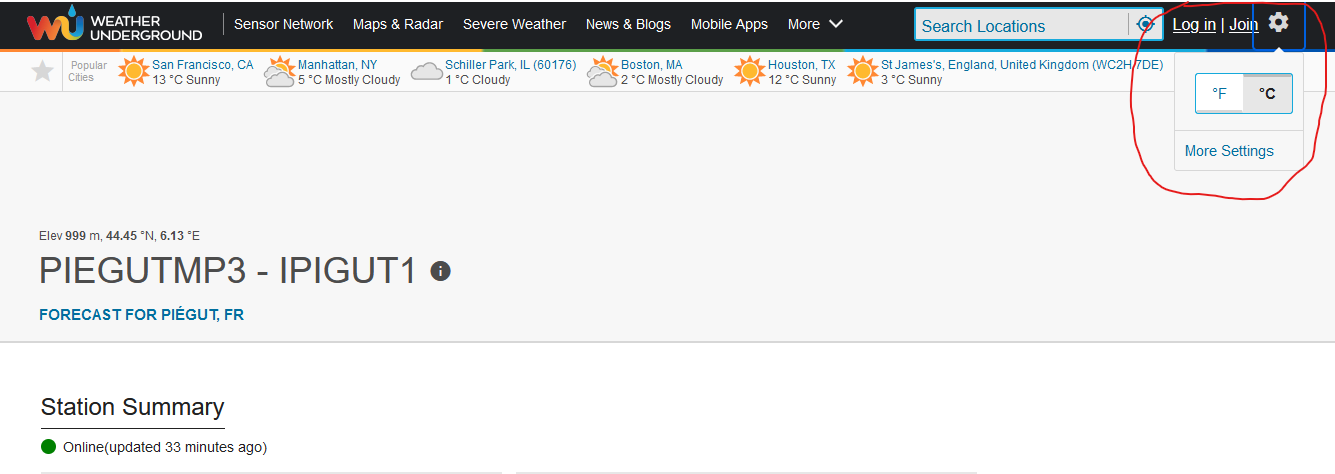 Une petite précision toutefois, le site est en anglais et il y a un risque que lors de votre première visite les degrés soit affiché en °F [1]. Mais ne vous inquiétez pas en cliquant sur la molette en haut à droite comme sur l’exemple suivant :